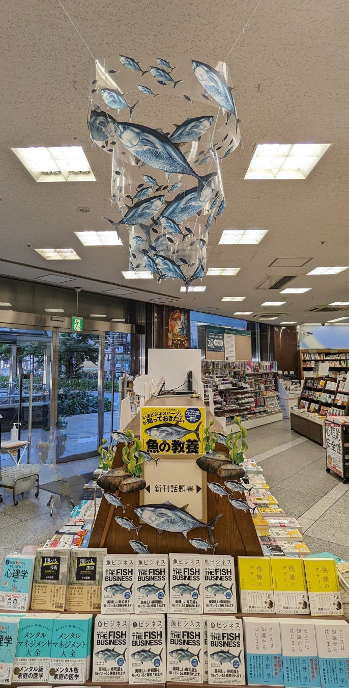 第10刷を実施するまでは書店での施策がカギとなりました。発売当初から、カバーにある魚のイラストが「インパクトがありすぎる!」と好評をいただき、2023年7月1日から9月30日までの3カ月間で店頭ディスプレイコンクールを開催。「まるで書店の中を泳いでいるような『マグロ』のイラスト」が目を引き、書店での売れ行きを後押ししました。