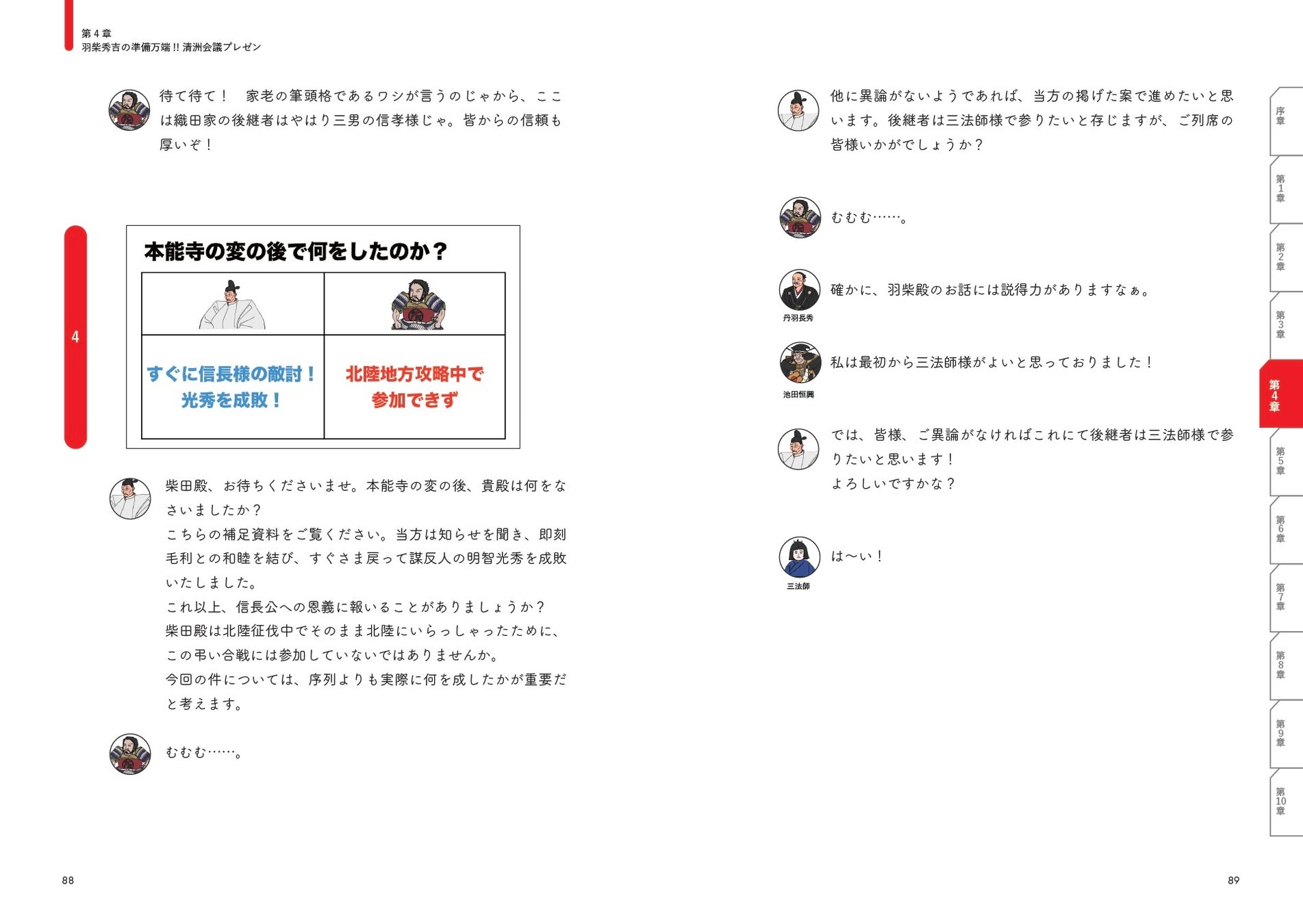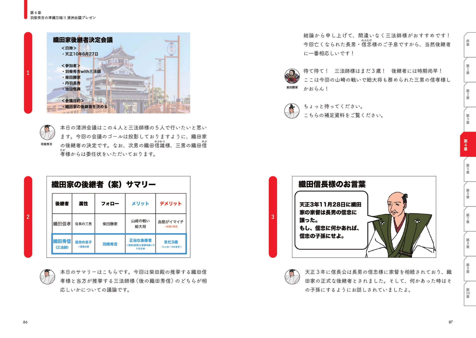 この本は、「面白く読み進めるうちに、プレゼンのさまざまなテクニックが頭にしっかり残る一冊」というコンセプトでつくっています。誰もが知っている日本史の出来事を題材にし、「プレゼンター」は歴史上の11人の偉人。「もしも坂本龍馬がPowerPointで薩長同盟の提案書を作ったら」「もしも聖武天皇が大仏建立のクラウドファンディングをしたら」「もしも徳川吉宗が目安箱設置を広く庶民に訴えかけたら」といったユニークな切り口で、「押さえておきたいプレゼンの基本・ノウハウ」を、しっかりと、惜しむことなく紹介しています。