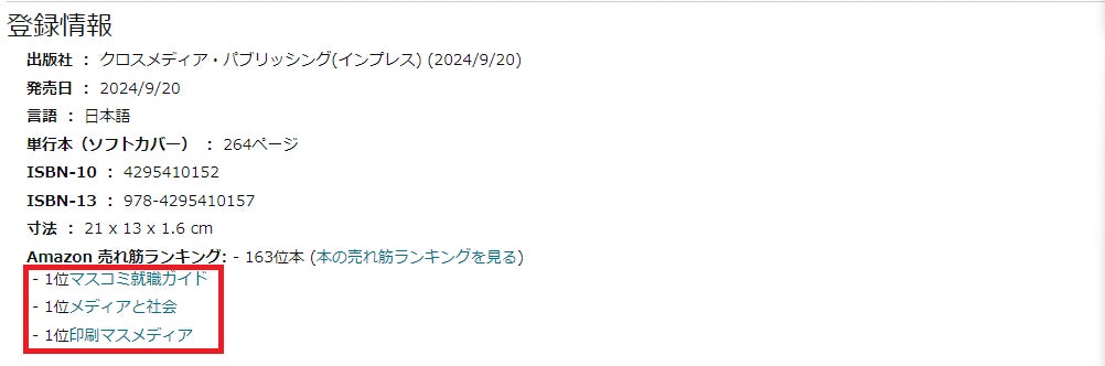 告知後はAmazonカテゴリランキング「マスコミ就職ガイド」「メディアと社会」「印刷マスメディア」で1位を獲得しました。また、Amazon総合ランキングでも163位まで上昇。