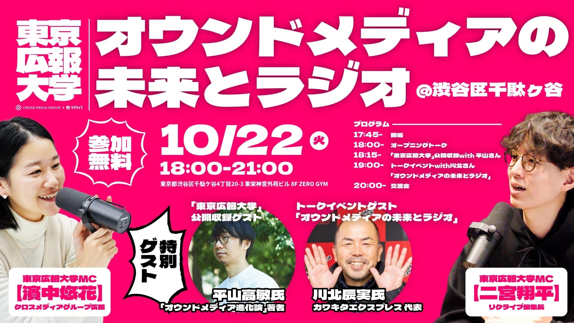 また、後半のトークイベントには株式会社カワキタエクスプレスの代表で、自らの情報発信で若手の採用に成功している川北辰実さんをお招きし、ラジオ発信の効果についてお話を伺います。
