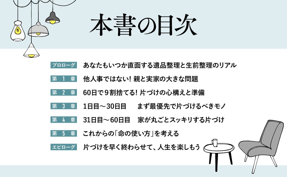 「生前整理」というと高齢者のためのものと考えがちですが、このように、本書を読んで「親だけでなく、自分も片づけを始めないといけないと感じた」という声が多く寄せられています。生前整理や遺品整理は、何をどう始めて良いか分からないもの。本書では、著者の2回の生前整理の実体験をもとに、無理なく片づけを進める具体的なステップを紹介。片づけが苦手な方や親世代にも優しく、わかりやすく説明しています。