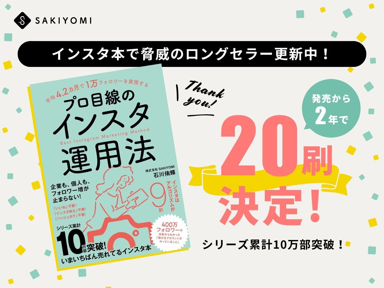 株式会社SAKIYOMI(本社:大阪市北区、代表取締役社長:吉田 睦史)の創業者でありChief Board Advisorである石川侑輝の著書『平均4.2カ月で1万フォロワーを実現する プロ目線のインスタ運用法』(2022年8月1日発売)の第20刷重版が決まりましたので、お知らせいたします。