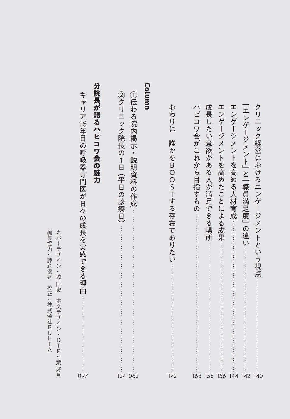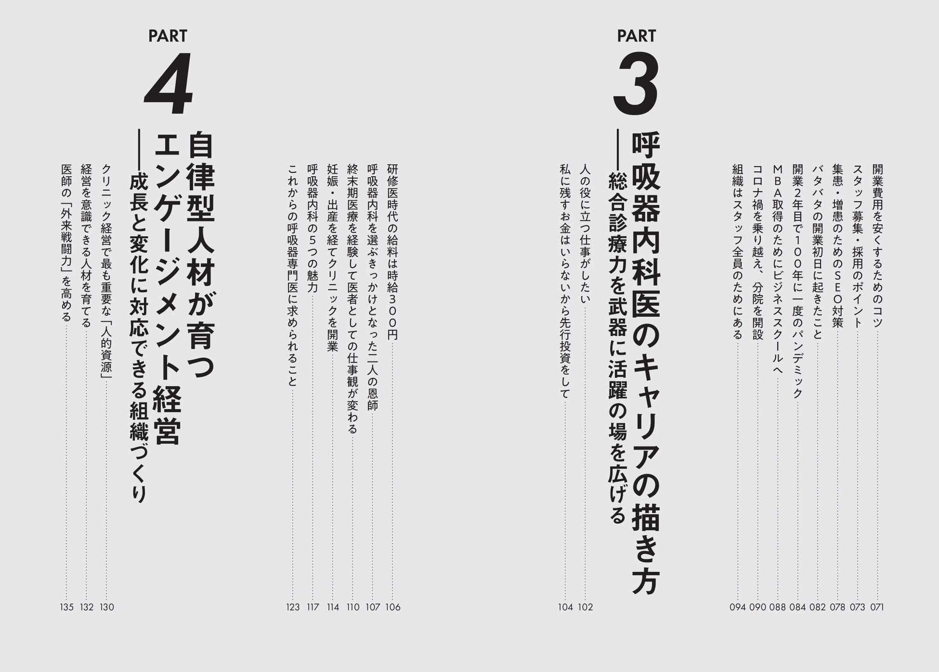 本書では、こうした人材育成の仕組みをはじめ、開業医に必要なコミュニケーションスキルの高め方、クリニックのためのSEO対策、集患・増患のためのポイントなど、開業医やこれから開業を目指される医師が知りたい知識・ノウハウが満載です。