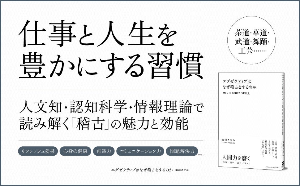 ビジネス書や実用書を中心に出版する株式会社クロスメディア・パブリッシング(本社:東京都渋谷区、代表取締役社長:小早川幸一郎)は、2024年12月27日に書籍『エグゼクティブはなぜ稽古をするのか』を刊行します。著者の梅澤さやかさんは、30年近くにわたり芸術・デザイン・ファッションを通じたブランド戦略に多数関わり、日本文化の魅力を伝えてきたカルチャーマーケティング・コンサルタント。本書では、「経営層がなぜ稽古に打ち込んでいるのか」を、日本文化に関する幅広い知見に加え、情報理論や認知科学を用いて解明。AI時代だからこそ再評価されている「稽古」の魅力と効能を伝える一冊です。「稽古」がどのように感性を磨き、ビジネス・日常生活に活きるのか、をわかりやすく解説いたします。