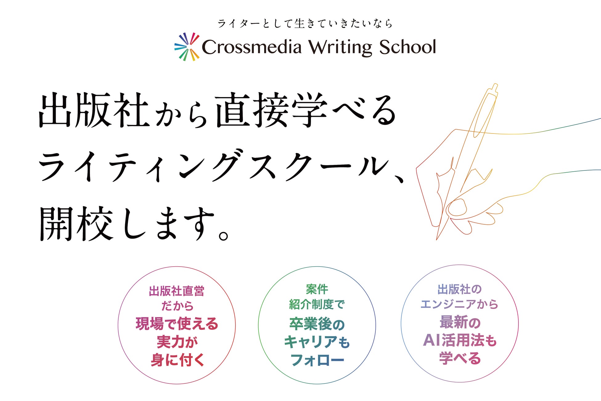 クロスメディア・パブリッシングは、ライターを社内で育成し、幅広いメディアに対応した品質の高いコンテンツ制作を日々追求しています。そこで、豊富な出版実績と現場で培ったノウハウを活かし、次世代のライター育成に向けた新たなスクールを設立する運びとなりました。