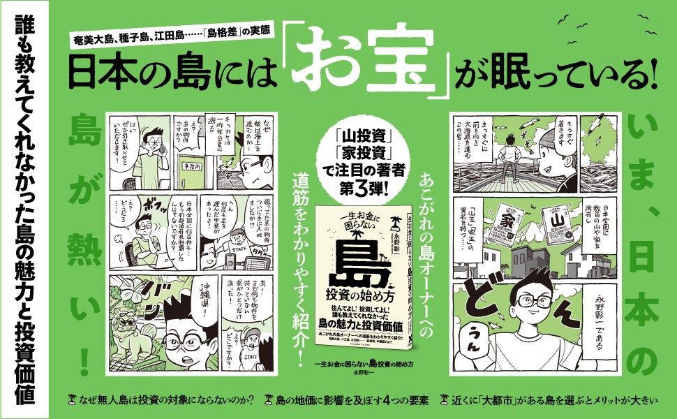 ビジネス書や実用書を中心に出版する株式会社クロスメディア・パブリッシング(本社:東京都渋谷区、代表取締役社長:小早川幸一郎)は、2024年8月2日に書籍『一生お金に困らない島投資の始め方』を刊行します。著者は「山王(やまおう)」の愛称で知られる永野彰一氏で、本書は『山投資』『家投資』に続く第3弾となります。文中では、日本の「島」に秘められた投資価値を解説しています。移住やワーケーション、レジャー、外国人投資家の進出など、島の多面的な可能性に着目し、その投資の魅力を具体的に紹介。島投資を始めることで得られる選択肢や利益の積み上げ方についても詳しく解説しており、投資としての島の潜在能力を最大限に引き出す方法を教えます。