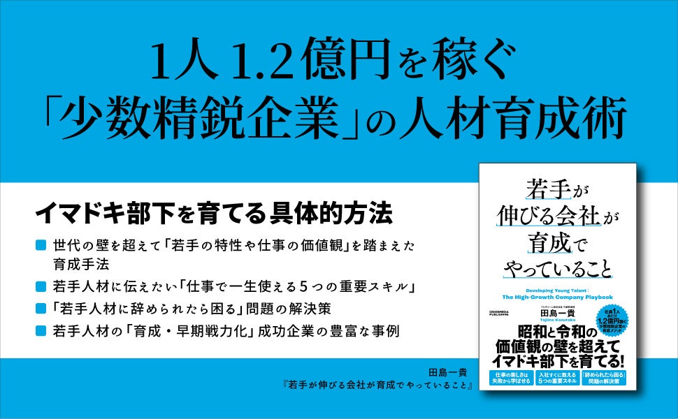 1人1.2億円を稼ぐ少数精鋭企業の人材育成術とは? 昭和と令和の価値観の壁を超えて、イマドキ部下を育てる方法をまとめた書籍『若手が伸びる会社が育成でやっていること』本日発売!