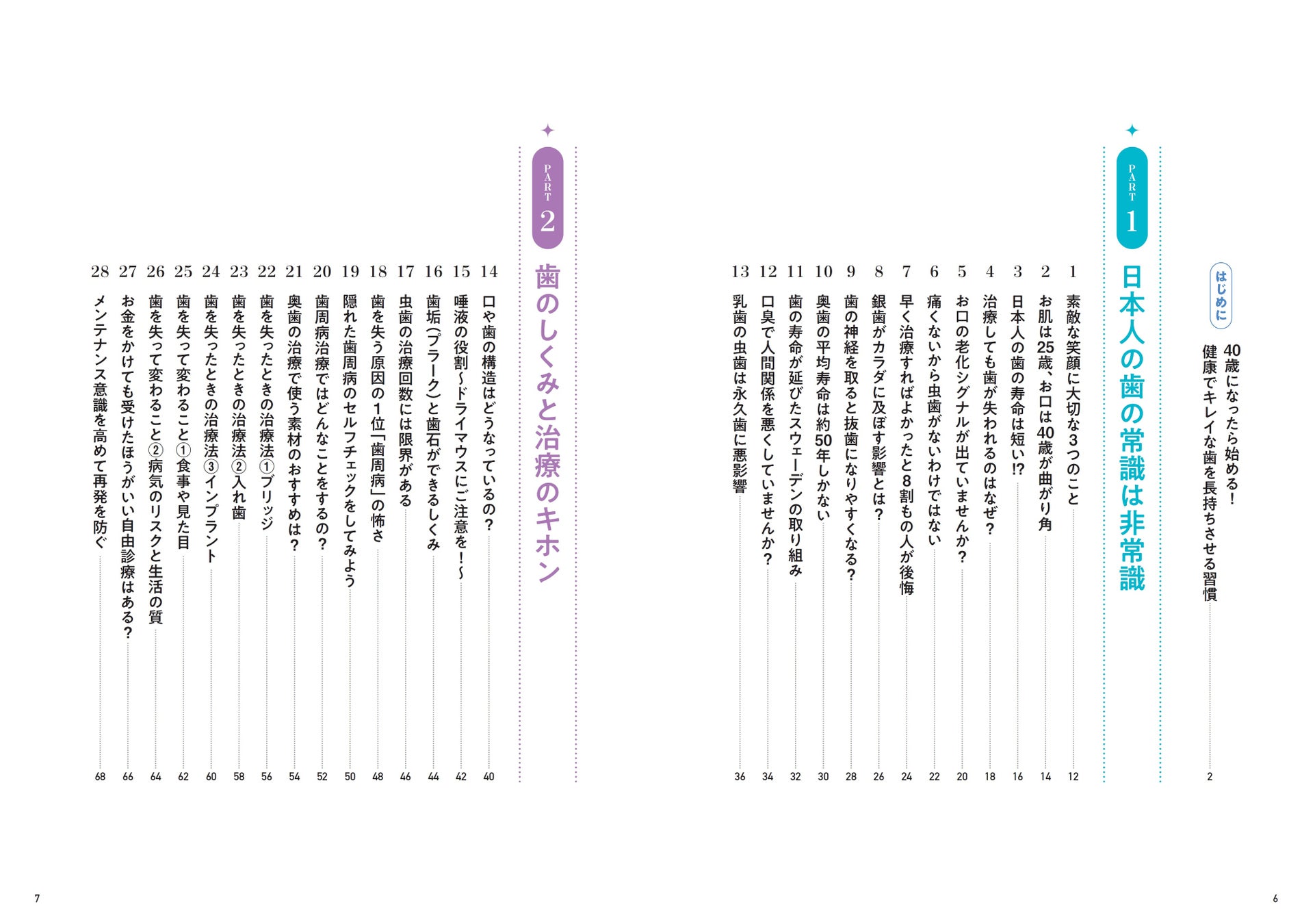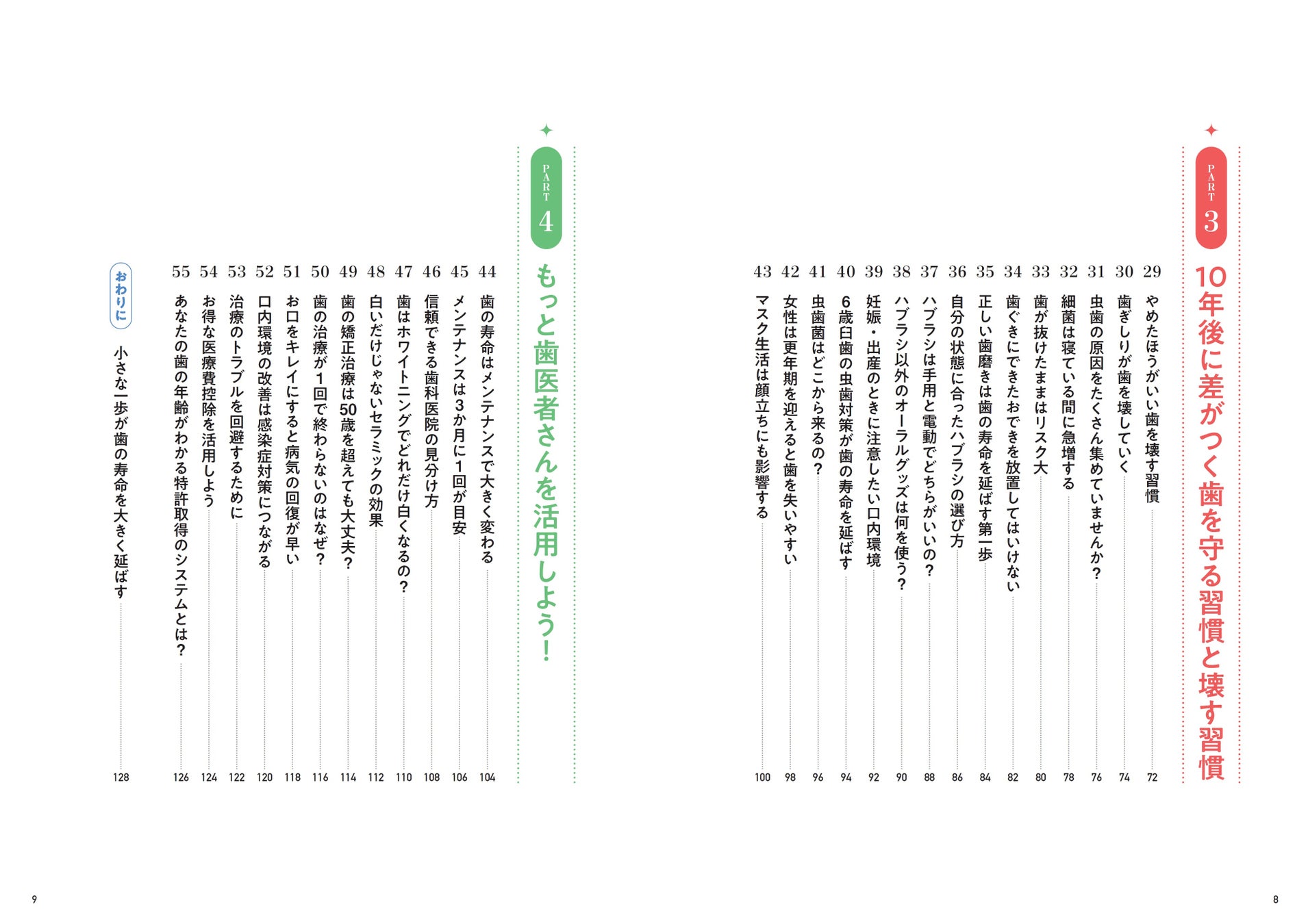 ケアを始めるにあたっては、考えなければならないことがたくさんあります。本書では、歯科医師300人に対して行ったアンケート結果をもとに、大切な自分の歯を長くキレイに保つために知っておきたい55の知識と習慣を紹介しています。フルカラーのイラストや表を100点以上掲載! スラスラ読み進められます。